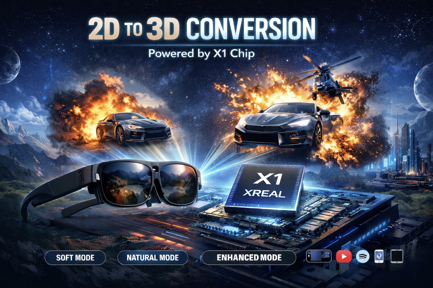 The hardware-based 2D-to-3D conversion is available in the XREAL lineup with the X1 chip, including: